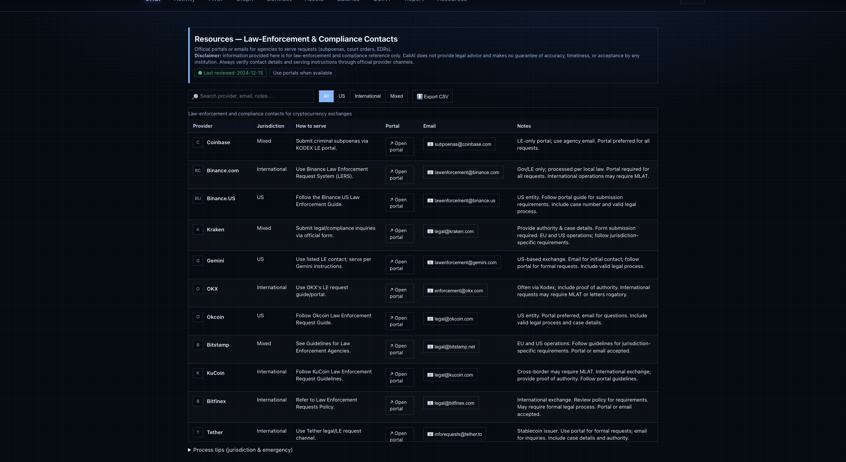 Cali Resources Directory consolidates key information about exchanges and service providers in one searchable space: law-enforcement portals, legal request addresses, compliance contacts, and practical notes from real investigations.
